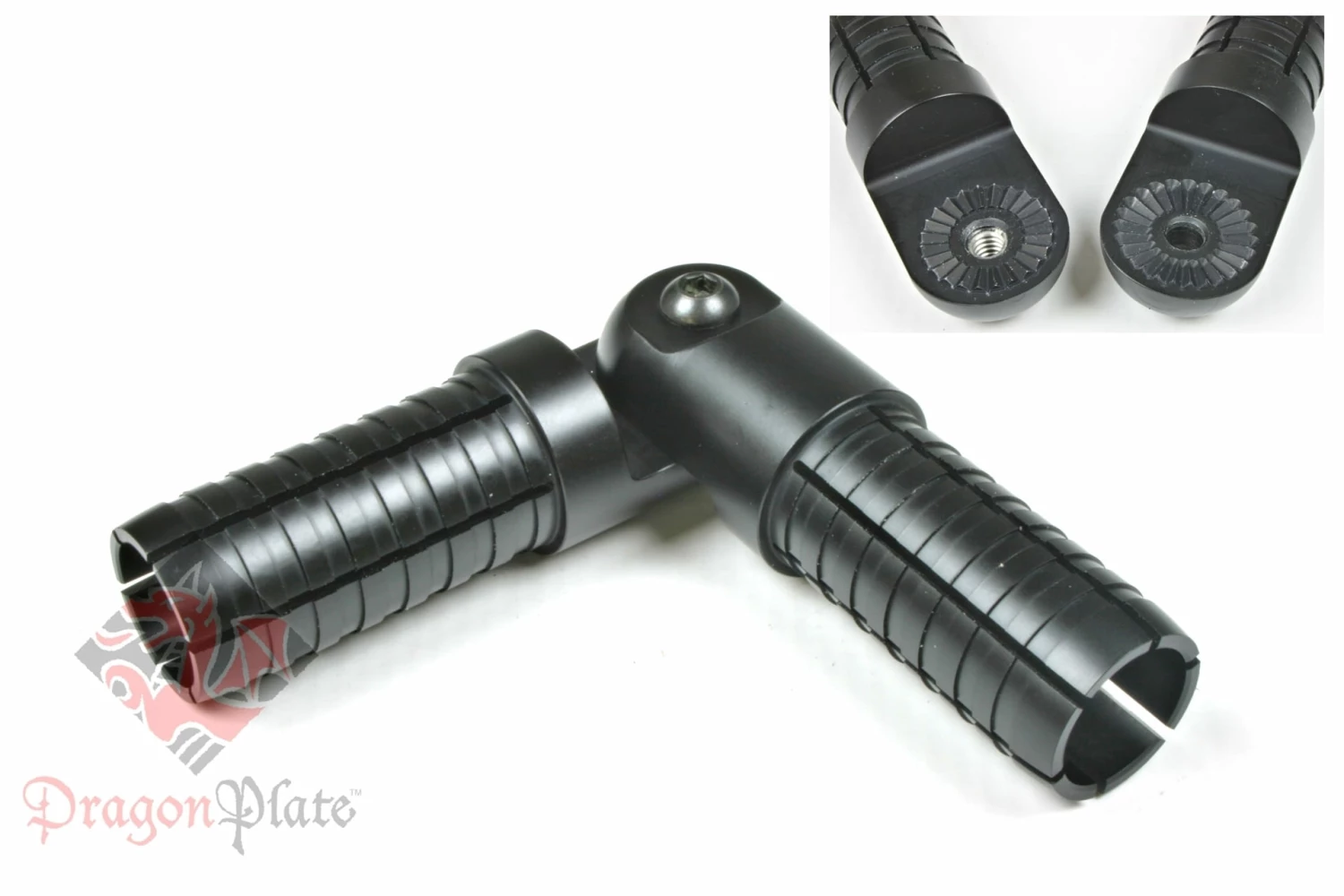 This joint can be used to connect two 0.75″ carbon fiber tubes that can be quickly and easily adjusted angularly. Each connector side has indexed serations that provide lockable 15° increments. Range of movement varies from -105° to 105°. Joint comes with screw that can be adjusted with allen wrench, or you can purchase optional knob or lever handle for adjustment of angle without the use of a tool. Simply loosen joint, set new angle and re-tighten.