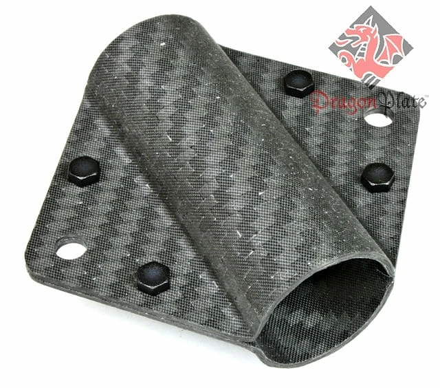 The DragonPlate Exterior Mounted Bracket (EMB) is made completely of carbon fiber composites, making it light-weight and strong. The EMB is a two piece construction that fits on the outside of a tube, allowing the connector to be attached to a completed carbon fiber tube frame. Two holes, one on each side, are provided to attach single-sided clevis connectors at any angle. The EMB is bonded to the tube with adhesive and is held together by four nylon screws (included) until adhesive cures. Also includes enough bond line control micro glass beads to ensure a proper bond line fit. For use with 0.75″ ID tubes with 1/16″ wall.