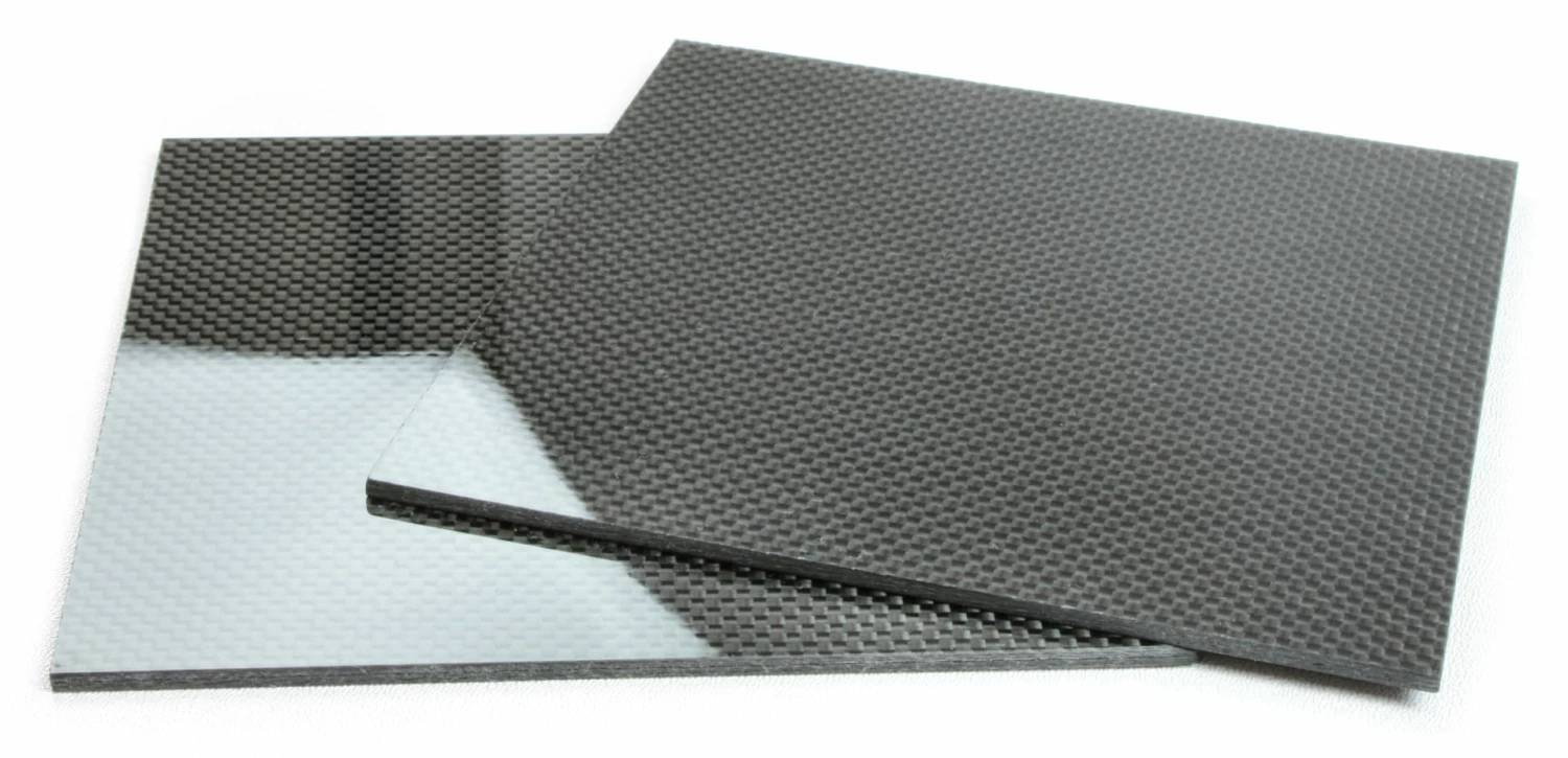 Our 1/8″ two-sided gloss by gloss solid carbon fiber laminates offer balanced and symmetrical lay-up schedules utilizing 90 degree and 45 degree 3k plain weave fabric. These laminates are composed of a tough, and rigid carbon reinforced epoxy matrix without any core material. Both sides have a mirror-like gloss finish.